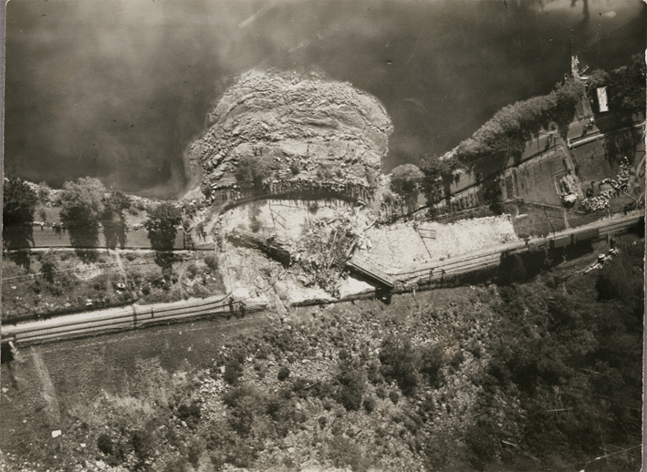 sprängladdning högre upp på branten. Fyllnadsmaterialet i banvallen ser torrt
