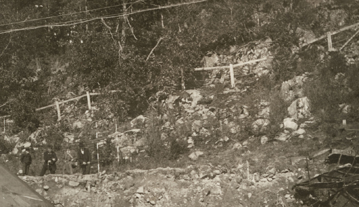 Längst ned till vänster står fyra personer på det som är kvar av banvallen. Snett