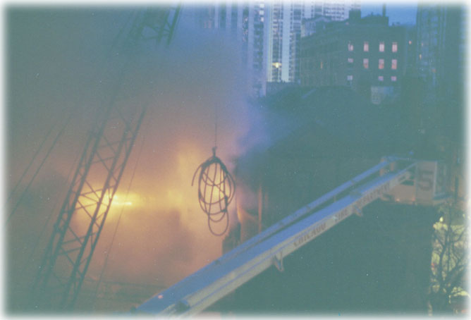 During my stay, I lived in a condominium at 65 East Scott Street. The area was regarded as safe. As usual in such buildings there was always a doorman at place around the clock. The building manager was a parant lady in her 40's . When I met her the first time for checking the apartment it was immediately clear to me that strong credentials were required to rent in this building. I left my credentials and after about a week everything was cleared. As early as day one, I got clear information about which regulations were in force. If one couldn't obey it there was only one way to go, i.e. OUT. I had a good relationship to the doormen who worked there. The manager I didn't see that often but now and then we met at the entrance. Mostly she wanted to get a confirmation that I enjoyed with my accommodation. Everything worked fine and I had nothing to complain about. One night in April -77 I awoke to the smell of smoke inside the apartment. When I looked closer, I saw heavy smoke emission from a smaller building located about 50 yards from my apartment (photo below). My air cond sucked smoke into the apartment. I turned off the conditioner and could see that the Fire Department was already in place. I had previously noted that the building seemed discarded and uninhabited. I didn't think closer about this event because fires were commonplace in this city.