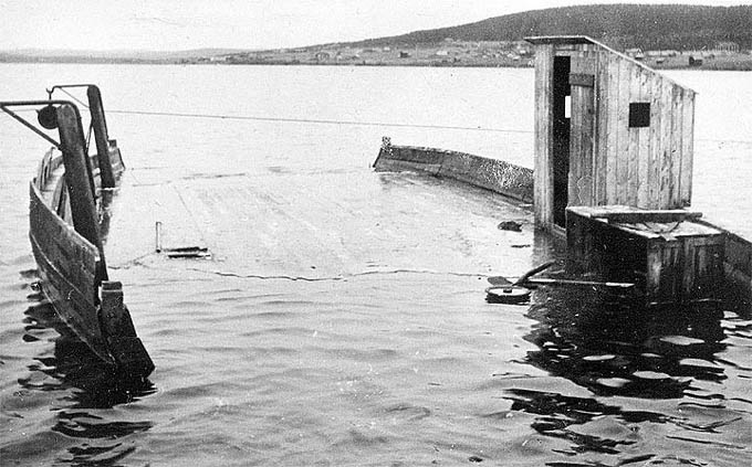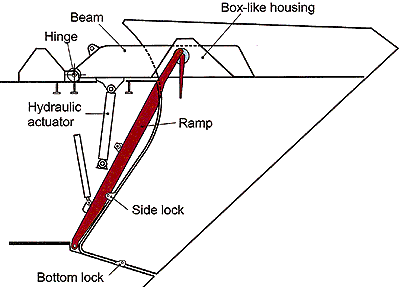 the bow, due to heavy wave loads, and tilted over the stem. The ramp was