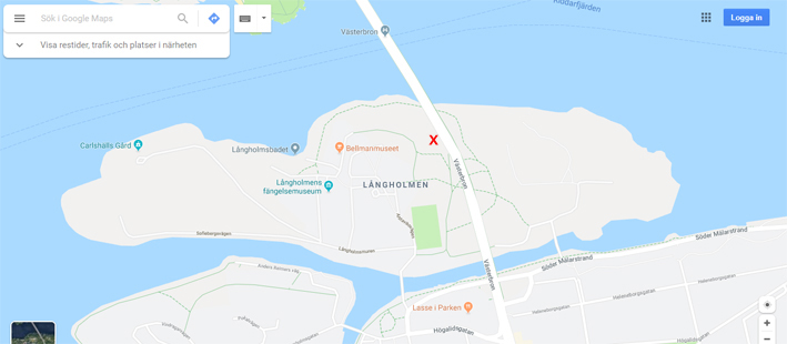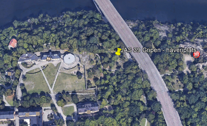 Långholmen, Stockholm. The JAS plane crashed at the red X.
