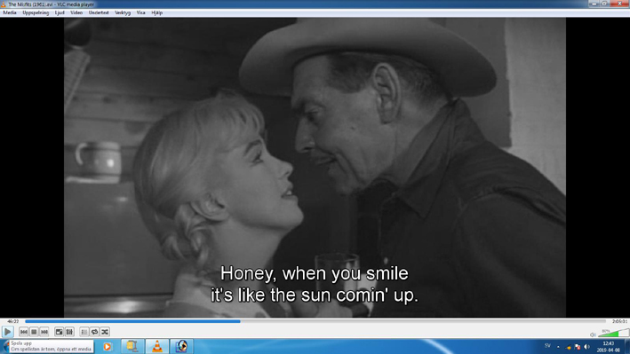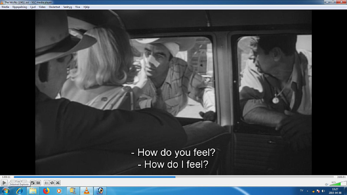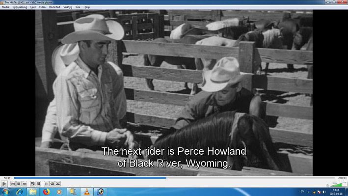 Monroe's last movie was "The Misfits", 1961. Arthur Miller wrote the screenplay. When I watch the movie I get the feeling that he is predicting Monroe's death. The action takes place in Reno, Nevada. Monroe acts as the 30-year-old Roslyn Tabor. She recently applied for a quick divorce in Reno from her husband Raymond. Her landlord, Isabelle, who is also divorced, helps Roslyn at the divorce. When it's done, they head to a  bar to have a drink. There they meet the aged cowboy Gaylord 'Gay' Langland (Clark Gable) and his companion Guido (Eli Wallach). They are dedicated to catching of wild horses (Mustangs) in the Nevada desert. The captured horses are sold to buyers who in turn sell them for animal feed production. Guido has a cottage in the countryside that serves as a base when hunting. They invite Roslyn and Isabelle to come with them to the cottage. Miller builds up the story from a social-psychological perspective where he keeps Gay and Guido constantly reminding us that freedom in the country side is better than wages in Reno. In this choice, they are considered as misfits. Tensions arise between Gay and Guido when it turns out that both are interested in Roslyn. During the last part of the film, the hunting of the horses is conducted. Guido has an aircraft that is used to chase the horses into a desert landscape. Once the horses are there, the hunt continues from a small truck. Guido is the driver while Gay stands on the truck´s flatbed with his lasso. When a horse is captured, a rope is tied around its neck and at the other end a large car tire. Then the hunt for the next horse continues. The exhausted horses give up after a while and lay down on the ground. After that, it is the buyers' job to pick up the horses. At the end of the hunt, Roslyn gets misgivings. She gets a nervous breakdown and demands that the horses shall be released. After some hesitation from Gay and Guido, the horses are released. At the same time, they understand that Roslyn is not the right woman for them.